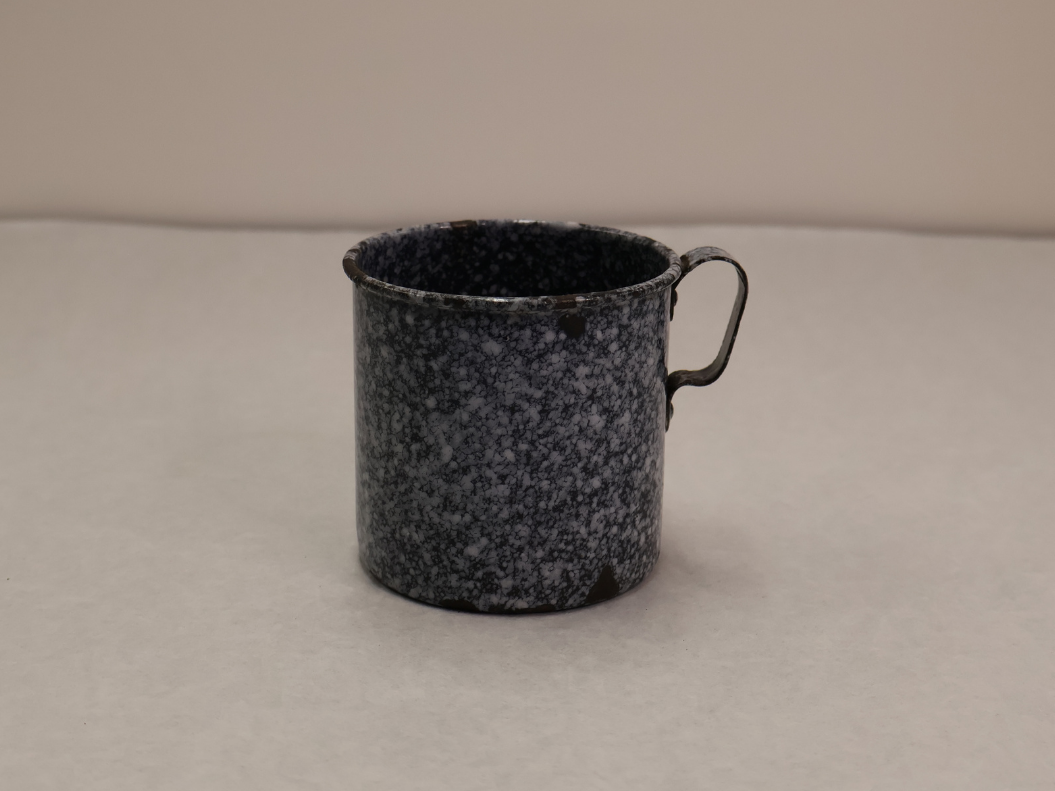Cup! This cup is made of metal and is enameled. This enamel finish would make it durable, meaning you could use it for many years. You could use this for hot or cold beverages.