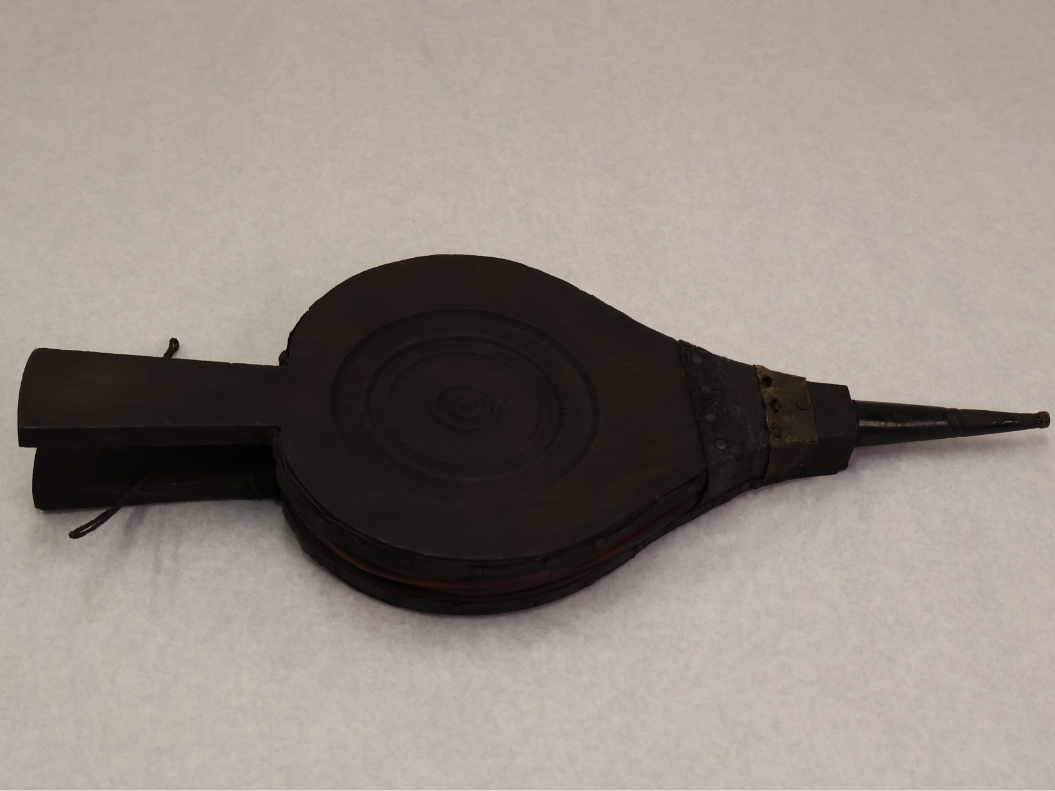Fireplace bellows! Bellows are used to blow air to light a fire. By opening and closing the wooden handles, air blows out of the pointed metal tip. Before homes had furnaces and centralized heat, bellows were an important tool to light fires in fireplaces.