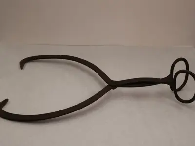 Ice tongs! These large metal tongs were used to carry ice. This would be useful if you had blocks of ice that you need to place in an icebox, or the precursor of a refrigerator that was cooled by ice.