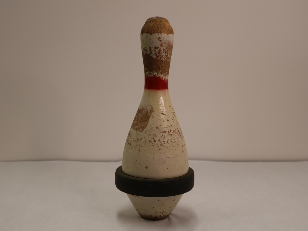 Bowling pin! This painted wooden object is a bowling pin. The band around the base is rubber, and the pin is shaped this way so that wobbles and topples over when hit with a bowling ball or another pin. This pin came from a bowling alley in Bowmanville that was located near the corner of King Street East and Division Street.