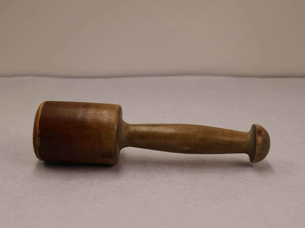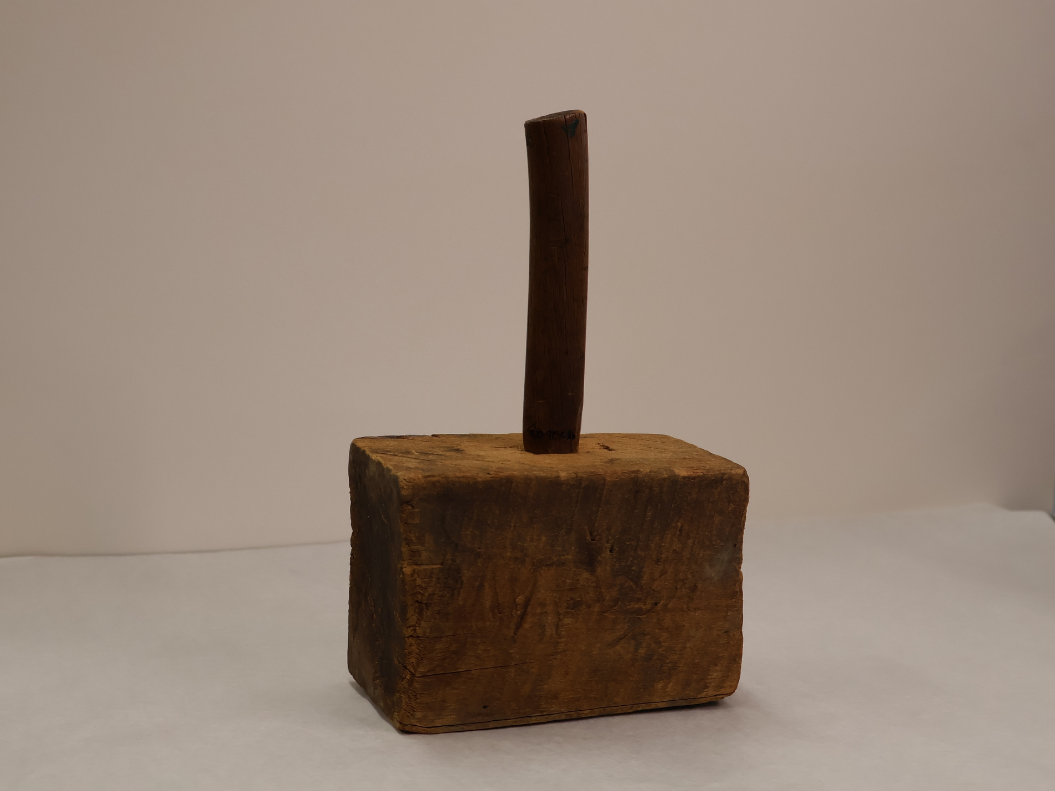 Mallet! Fashioned out of wood, this mallet is an example of a homemade tool. Mallets, like hammers, would be used to strike a surface to drive a tool or nail into another material.