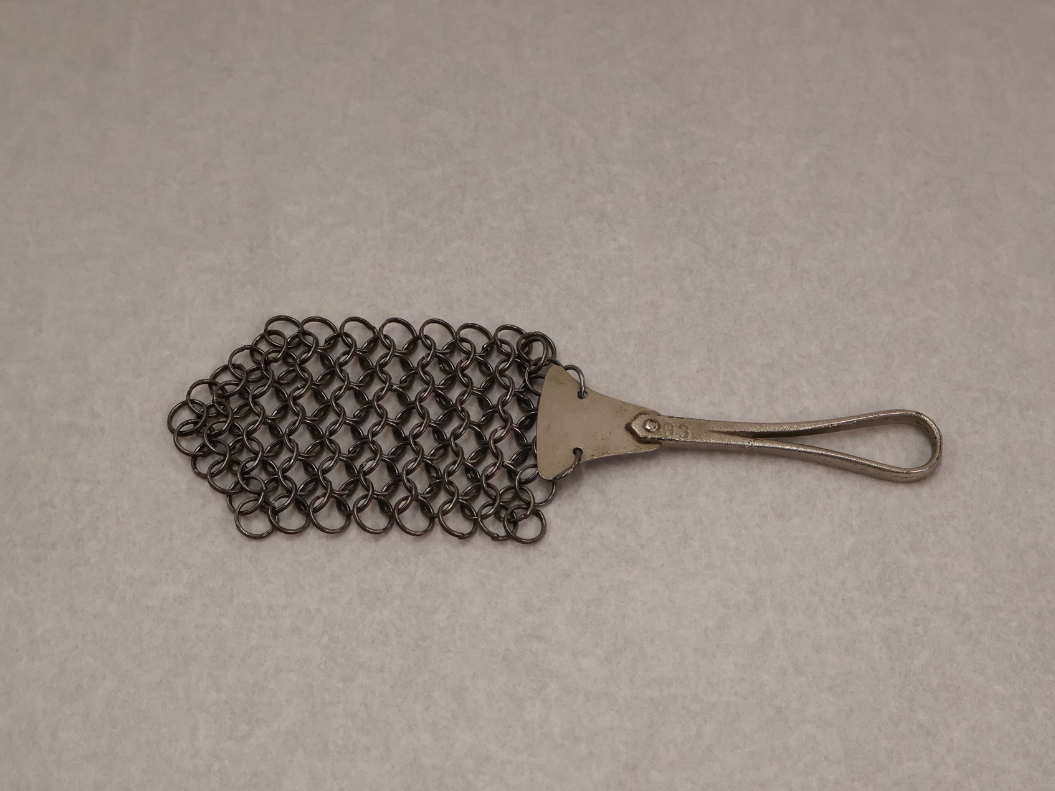 Pot scrubber! While this metal object might look like something a knight would wear in Medieval times, it is actually a scrubber to clean pots. Over 100 years ago, pots and pans were often made out of cast iron and this device would help to scrape off baked on food.