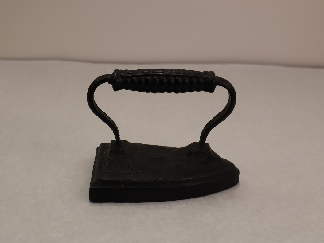 Clothes iron! Did you know, nearly 100 years ago, ironing clothes involved starting a fire and heating a cast-iron like this one on a stove? Irons today plug in and use electricity, but the concept is the same that clothing is lightly moistened with water and the smooth surface of the iron is passed over to eliminate wrinkles. On the handle of this object is "J. Smart," as it was manufactured by the James Smart company in Ontario in the 1850s.