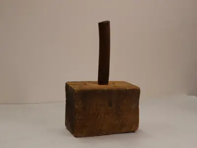 Pestle! A pestle is a type of food grinding device that is often used in a bowl-shaped mortar. Pestles and mortars were used before electric blenders, and could be useful for things like herbs, spices, and sauces like pesto. As it is made out of wood, this pestle was likely a homemade tool, rather than made in a factory.