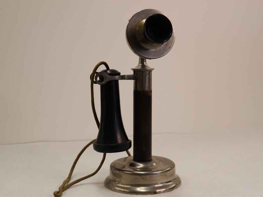 Telephone! This is an early version of a telephone from the 1910s. To use it, you would listen with the earpiece that hangs next to the mouthpiece, into which you would talk like a microphone. This telephone was made by Jaynes Electrical Co., Buffalo, New York. Locally in Bowmanville, The Bell Telephone Company began operating in 1880 with Thomas Bingham as the first manager. The first five subscribers were: John McClellan, McClellan and Co., Brittain Brothers, The Dominion Telegraph Co., and the Station Hotel. By 1883 there were 46 subscribers and by 1899 it had jumped to 80 people using telephones locally.